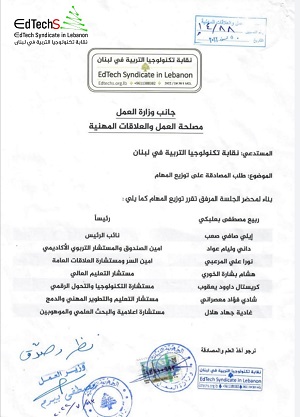 صادق وزير العمل الدكتور مصطفى بيرم على توزيع المهام لأعضاء المجلس التنفيذي الاول لنقابة تكنولوجيا التربية في لبنان الذي فاز بالتزكية وقد وزعت المسؤوليات كالآتي :