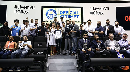 وشارك في المحاولة التي نُظّمت بدعم من سامسونج، 461 شخصاً من زوار جيتكس ارتدوا على وجوههم أجهزة الواقع الافتراضي “جير” من سامسونج، المدعوم بتقنيات “أوكيولس”، بينما كانوا يشاهدون ويعايشون في مسرح رباعي الأبعاد (4DX) لعبة القطار السريع الدوار المصوّرة بالتقنيات الافتراضية. وكان المنظمون يتتوقعون مشاركة 250 شخصاً في هذه الفعالية، إلا أن الحضور الكبير في المعرض ساهم بتحطيم الرقم العالمي وتحقيق مايقارب ضعفه.