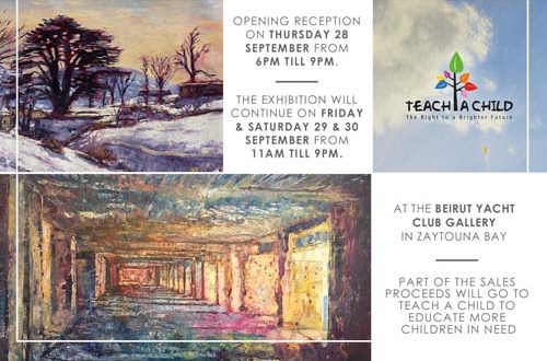 تنظّم جمعية Teach a Child معرض “Art for Education” للفنان “توم يونغ” دعماً للجمعية برعاية السفارة البريطانية وذلك في صالة عرض نادي اليخوت، الزيتونة باي، بيروت، الذي سيتم افتتاحه يوم الخميس 28 أيلول، من الساعة السادسة حتى التاسعة مساء، فيما يقام المعرض في 29 و30 أيلول، من الساعة الحادية عشر صباحاً حتى التاسعة مساء
