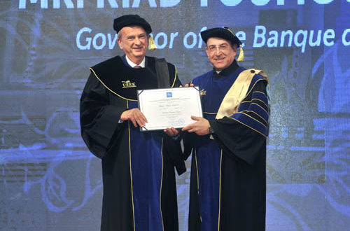 وأردف قائلاً: “نحتفل اليوم بمنح دكتوراه فخرية إلى رجل متألق، لا يمتلك رغبة قوية وصلبة في النجاح فحسب، بل هو حريص أيضاً على نشر هذه الرغبة بين الشباب ورواد الأعمال اللبنانيين من خلال جهوده الدؤوبة وتفانيه وشغفه. إنّه رياض سلامة، حاكم مصرف لبنان وأحد أفضل حكّام المصارف المركزية عالمياً”.