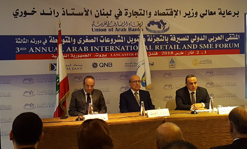 وألقى الوزير خوري كلمة قال في مستهلها: “إنه لشرف لي أن أكون بينكم اليوم في الملتقى العربي الدولي للصيرفة بالتجزئة وتمويل المشروعات الصغرى والمتوسطة الحجم بدورته الثالثة، خاصة وأنه يشكل أهمية كبيرة لما تلعبه المصارف والأسواق المالية في دولنا العربية من دور حيوي وهام في تنمية الاقتصاد والاستثمارات، إن لجهة توفير التمويل أو تحديث عمليات الإنتاج أو حتى تعبئه الموارد المالية والمدخرات وتوجيهها نحو الاستثمارات المنتجة”.