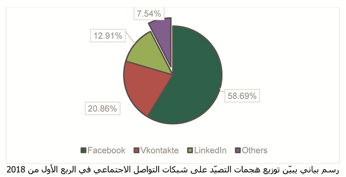 وقد كان فيسبوك، بداية العام الجاري، موقع التواصل الاجتماعي الأكثر تعرضاً للاستغلال من قبل المحتالين، الذين كثيراً ما كانوا يزيفون صفحات هذا الموقع في محاولة منهم لسرقة البيانات الشخصية عبر هجمات التصيّد. وتشكّل هذه المحاولات جزءاً من توجه استمرّ طويلاً؛ ففي العام 2017، أصبح فيسبوك أحد أهم ثلاثة أهداف لهجمات التصيّد بشكل عام، بنسبة 8% تقريباً، تلته شركة مايكروسوفت بنسبة 6%، فخدمة “باي بال” بنسبة 5%. أما في الربع الأول من 2018، فجاء فيسبوك في صدارة الشبكات الاجتماعية الأكثر عرضة لهجمات التصيد، تلته خدمة VK (خدمة تواصل اجتماعي روسية عبر الإنترنت) فموقع “لينكد إن”. ومن المرجّح أن يكون السبب الكامن وراء ذلك هو العدد الهائل من مستخدمي فيسبوك والبالغ 2.13 مليار مستخدم نشط شهرياً، بمن فيهم أولئك الذين يسجلون الدخول إلى تطبيقات غير معروفة باستخدام بيانات اعتمادهم على فيسبوك، ما يمنح تلك التطبيقات حق الوصول إلى حساباتهم، ومن شأن ذلك أن يجعل مستخدمي فيسبوك غير الحذرين هدفاً مربحاً لهجمات التصيّد الإلكتروني.