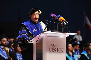 وختاماً، توجّه إلى المتخرجين بالقول: “إليكم أيها الأحبّة وأنتم تخرجون من عالم منظمّ وأنيق، إلى فوضى سوق العمل والحياة المعقّدة، أقول لكم في خلاصة رحلتي الأوليّة هذه: انّ كلّ شيء متناسق ومتواصل. نعيش ضمن أبعاد عدّة، لكن مترابطة، فهي من خالق واحد ولحظة واحدة. تعلّمت أنّه عندما بدأ الانسان يفهم قوانين الطبيعة، في القرون التنويريّة، بدأت تتدحرج عروش الملوك والسلاطين. فمهما علت شؤون السياسة، تبقى قوانين الطبيعة والإنتاج والاقتصاد أقوى. فشاء من شاء وأبى من أبى، إذا لم نصلح الإنتاجيّة في وطننا، لن يقف نمو الدين العام ولن نفلت من الانهيار الكبير. وتعلّمت أنّ المعرفة الحقيقيّة تقّرب من الايمان الصافي، وتبعد عن التزمّت والأصوليّة. فالمعرفة الحقيقيّة تنضح سعادةً ومحبة وسلاماً. ولأن لكلّ انسان وزنات ورسالة، ولأن الأوطان الراقية هي أرض خيّرة ومساحة خصبة لتفجير طاقات أبنائها وابداعاتهم، بالله عليكم أقول لكم وأنتم تدخلون عالماً يتخبّط بالحقد والجهل، أن تلتزموا بناء الوطن بتناسق تام مع قوانين الطبيعة وصفاء المعرفة وإلهامات الروح… فلن يكون لبنان بعد اليوم علامةً للفشل. ولن يكون لبنان بعد اليوم بلداً عاجزاً عن إدارة شؤونه. وطن عبء على مواطنيه وخيبة لمحبّيه. وطن يرهن أولاده بدين لأجيال قادمة، ويصل مستوى اليأس بين شبابه الى حدّ الانتحار الجسديّ. لا تقبلوا بعد اليوم أن باسم الطائفيّة والسياسة الضيّقة، ينقض كلّ ما تعلمتموه. لا تقبلوا بعد اليوم ألاّ تكون الإنتاجيّة، في صلب ميثاق عيشنا المشترك. ويكون التنوّع في الوحدة غنىً لكلّ واحد من أبناء لبنان. وشهادة حيّة في العالم، على قدرة أبناء الله الواحد، ومعاً، في تشييد مستقبل واعد. هكذا نبني وطناً يكون فيه “الانسان أولاً”، لأنّه محور الخلق وأرقاه. ويكون لبنان وطن سعادة الانسان ونموّه من ضمن مسيرة كونيّة نحو نهاية الزمن… وإلى ما ورائه المهيب!”