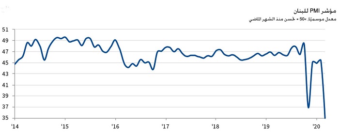 وشهدت القراءة الأخيرة لمؤشر PMI انخفاضًا ملحوظًا من 45.4 نقطة في شهر شباط إلى 35.0 نقطة في شهر آذار، مشيرةً إلى تدهور النشاط الاقتصادي لشركات القطاع الخاص اللبناني بأسرع وتيرة له منذ بدء جمع البيانات في أيّار 2013.