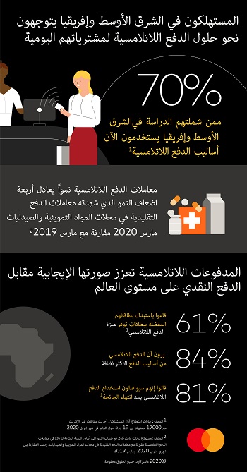 فرضت العديد من دول الشرق الأوسط خلال شهر مارس الماضي قيوداً أسهمت في تغيير النمط المعيشي للعديد من المجتمعات في تلك الدول. ولجأ عدد كبير من المستهلكين على إثر تلك القيود إلى تبني حلول الدفع اللاتلامسية عند شراء احتياجاتهم اليومية. وفي دراسة عالمية جديدة أجرتها شركة ماستركارد حول تغير سلوك المستهلكين في 19 دولة حول العالم، تم تسليط الضوء على إقبال المستهلكين المتزايد على استخدام تقنيات الدفع اللاتلامسية، حيث أكد 70% من المشاركين في هذه الدراسة في الشرق الأوسط وإفريقيا أنهم يستخدمون أساليب الدفع اللاتلامسية لأسباب تتعلق بالأمان والنظافة خلال فترة تفشي فيروس كورونا.
