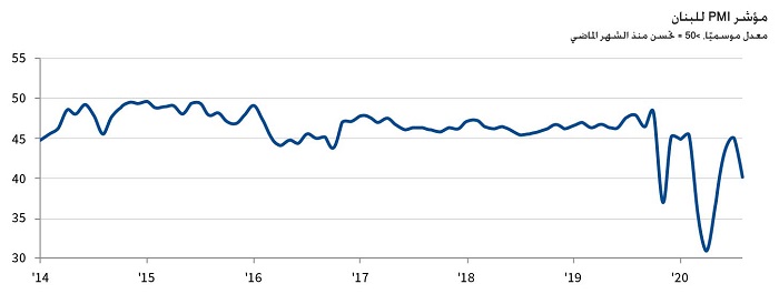 وشَهِدَت القراءة الأخيرة لمؤشر PMI انخفاضًا من 44.9 نقطة في شهر تموز إلى 40.1 نقطة في شهر آب، مشيرةً إلى أسرع تدهور في النشاط الاقتصادي لشركات القطاع الخاص اللبناني منذ ثلاثة أشهر وكانت ملحوظة بشكل عام.
