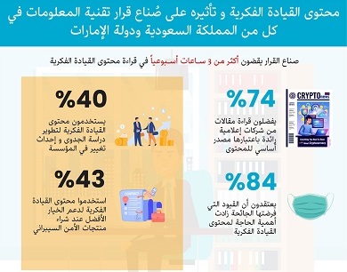 وكشف البحث أن صنّاع القرار في مجال أمن تقنية المعلومات في الإمارات العربية المتحدة والمملكة العربية السعودية يقضون أكثر من 3 ساعات أسبوعياً في الاطلاع على محتوى القيادة الفكرية، وهو الأعلى بين جميع المشاركين في هذا البحث.