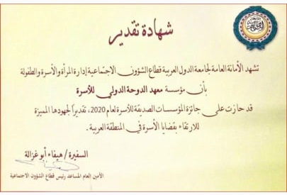 وتقديراً لهذا الالتزام، حصل معهد الدوحة الدولي للأسرة، عضو مؤسسة قطر، على أول جائزة للمؤسسات الصديقة للأسرة في المنطقة العربية لعام 2020 المقدمة من إدارة شؤون المرأة والأسرة والطفولة في قطاع الشؤون الاجتماعية بجامعة الدول العربية.