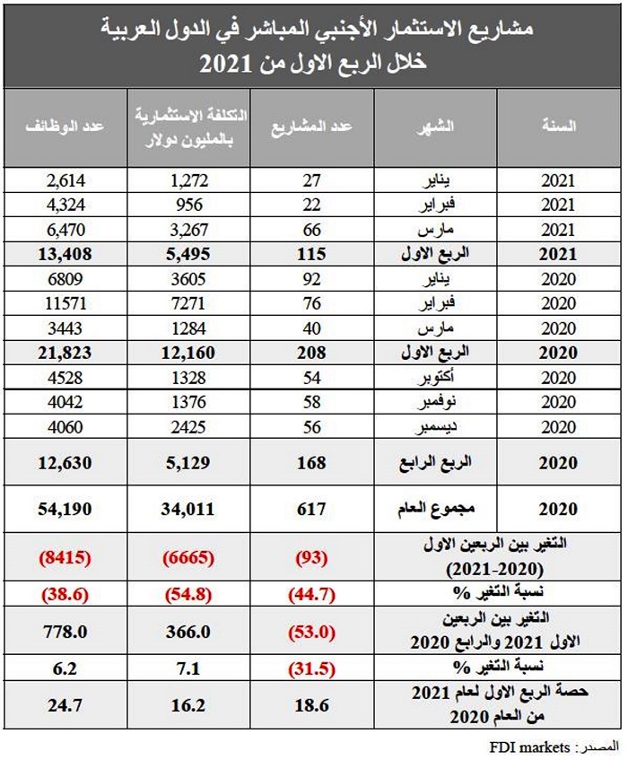 وأشار الصبيح في افتتاحية النشرة التي جاءت بعنوان “توقعات متباينة للاستثمار الأجنبي في المنطقة” أن هذا التباين فيما بين عدد وتكلفة مشاريع الاستثمار الأجنبي المباشر الجديدة في الدول العربية التي شهدت تراجعا من جهة وما بين نمو حجم تدفقات الاستثمار الأجنبي المباشر بفضل عمليات الاستحواذ والاستثمار في الادوات الاخرى من جهة أخرى ربما يعزز من التوقعات الإيجابية في مواجهة المؤشرات السلبية التي شهدتها أرقام المشاريع في الدول العربية في الأشهر الخمسة الأولى من العام 2021.