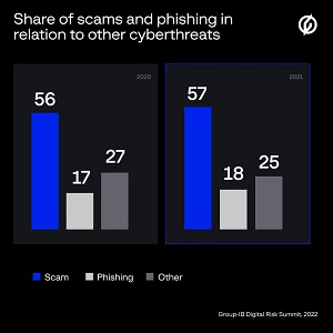 مع تزايد عدد مستخدمي الإنترنت الذين يقعون ضحية للجرائم الإلكترونية بشكل يومي، بات المحتالون يفضلون الأساليب القديمة الجيدة مثل التصيد الاحتيالي (18%) والنصب والاحتيال (57%)، والهجمات باستخدام البرمجيات الخبيثة وهجمات السمعة (25%). وفي عام 2021، كانت عمليات الاحتيال (scam) هي الهجمات الأكثر شيوعًا ضمن مشهد الجرائم الإلكترونية.