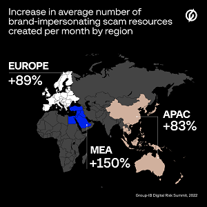 وقد ارتفع أيضًا عدد عمليات الاحتيال الشهرية التي تنتحل صفة العلامات التجارية، فعلى مستوى الشرق الأوسط وأفريقيا، لاحظ محللو غروب-آي بي زيادة بنسبة 150% في هذه العمليات.