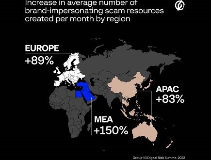 وقد ارتفع أيضًا عدد عمليات الاحتيال الشهرية التي تنتحل صفة العلامات التجارية، فعلى مستوى الشرق الأوسط وأفريقيا، لاحظ محللو غروب-آي بي زيادة بنسبة 150% في هذه العمليات.