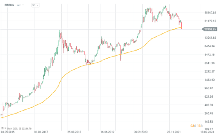 كسرت Bitcoinالدعم متعدد السنوات الذي حدده المتوسط المتحرك لمدة 200أسبوع (SMA 200). رسم بياني على مقياس لوغاريتمي. المصدر: xStation 5