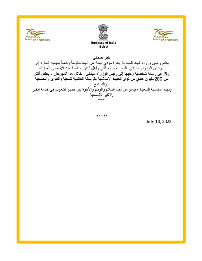 يتقدم رئيس وزراء الهند السيد ناريندرا مودي نيابة عن الهند حكومةً وشعباً بتهانيه الحارة إلى رئيس الوزراء اللبناني  السيد نجيب ميقاتي وأهل لبنان بمناسبة عيد الأضحى المبارك.