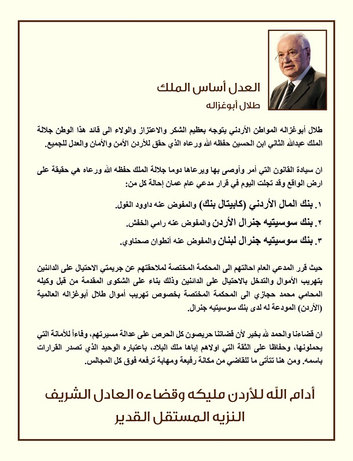طلال أبوغزاله المواطن الأردني يتوجه بعظيم الشكر والاعتزاز والولاء الى قائد هذا الوطن جلالة الملك عبدالله الثاني ابن الحسين حفظه الله ورعاه الذي حقق للأردن الأمن والأمان والعدل للجميع.