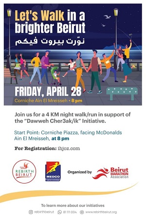 تستعد بيروت لاستقبال ماراثون مصغّر من تنظيم جمعية Rebirth Beirut وميدكو وبالتعاون مع جمعية Beirut Marathon وذلك بتاريخ 28 نيسان 2023 في تمام الساعة 8:00 مساءً في كورنيش عين المريسة، المنارة ، بيروت. هذا الحدث الذي يهدف إلى دعم مبادرة “ضوي شارعك” التي أطلقتها جمعية Rebirth Beirut بالشراكة مع ميدكو ينطلق بزخم كبير ويجمع أبناء المدينة في حدث رياضي – اجتماعي بامتياز.