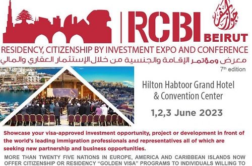 ينطلق مؤتمر ومعرض “الإقامة والجنسية من خلال الاستثمار المالي والعقاري”، في دورته السابعة هذا العام حيث سيُعقد في فندق الهيلتون حبتور (سن الفيل)، بيروت. وذلك في الفترة من الخميس 1 حزيران إلى السبت 3 حزيران 2023. ويفتح المعرض أبوابه يومياً من الثالثة بعد الظهر حتى التاسعة مساءً ويوم الافتتاح الساعة الخامسة بعد الظهر بحضور فعاليات رسمية واجتماعية وخبراء في المجال.