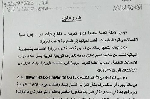 بعد أن أعلنت وزارة الإتصالات عن إطلاق مزايدة تلزيم الخدمات البريدية التي تمتد من ٧/٦/٢٠٢٣ إلى ١٢/٧/٢٠٢٣، وبعد أن طلبت الوزارة تعميم هذا الإعلان من قبل وزارة الخارجية التي قامت بدورها بإبلاغ السفارات اللبنانية في الخارج كما والأمانة العامة لجامعة الدول العربية، قامت الامانة العامة – القطاع الإقتصادي – ادارة تنمية الاتصالات وتقنية المعلومات بنشر تعميم دعت من خلاله الإدارات البريدية العربية إلى المشاركة بالمزايدة التي أطلقتها وزارة الإتصالات.