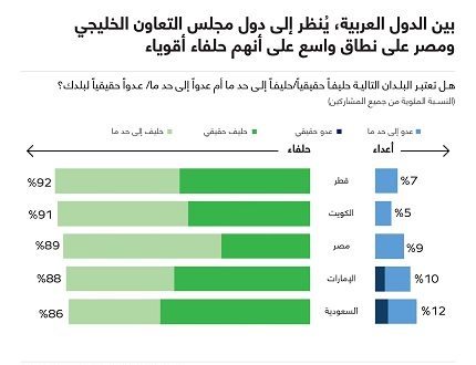 وتسلط نتائج استطلاع هذا العام الضوء على التحولات الجيوسياسية في العالم العربي، حيث يعتبر الشباب العربي في المنطقة تركيا والصين حليفين حقيقين لبلدانهم أكثر من الحلفاء التقليديين مثل الولايات المتحدة وروسيا.