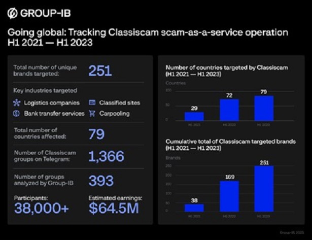 واكتشف خبراء «جروب-آي بي» كيفية تصدير مخطط الاحتيال إلى أوروبا في بادئ الأمر، قبل انتقاله إلى مناطق عالمية أخرى مثل الشرق الأوسط وأفريقيا والولايات المتحدة، ومنطقة آسيا والمحيط الهادئ. واعتباراً من النصف الأول من عام 2021، استهدف القائمون على حملة الاحتيال “كلاسيسكام” مستخدمي الإنترنت في 30 دولة، وكشف خبراء «جروب-آي بي» عن ارتفاع هذا الرقم إلى 79 خلال النصف الأول من عام 2023، كما ارتفع عدد العلامات التجارية المستهدفة في السوق العالمية من 38 إلى 251 خلال الفترة نفسها.