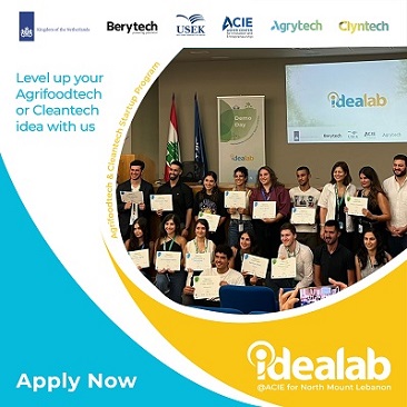 أطلق مركز آشر للابتكار وريادة الأعمال Asher Center for Innovation and Entrepreneurship – ACIE في جامعة الروح القدس – الكسليك الجولة الثّانية من برنامج “أيديالاب” IdeaLab في شمالي جبل لبنان. ويدعم هذا البرنامج المموّل من سفارة المملكة الهولندية في لبنان وبيريتك Berytech إطلاق الشركات النّاشئة في مجالي التكنولوجيا النظيفة والتكنولوجيا الزّراعيّة/الغذائيّة.