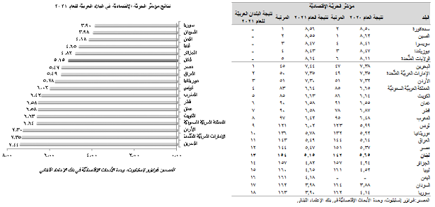 أَصدَرَت مؤسَّسة فرايزر إنستيتيوت (Fraser Institute) تقريرها السنوي للعام 2023 حول الحريّة الإقتصاديّة في العالم تقيس من خلاله مستوى الحريّة الإقتصاديّة في 165 دولة خلال العام 2021 عَبر تقييم مدى تشجيع السياسات والمؤسَّسات لهذه الحريّة. يَرتكز المؤشِّر على خمسة محاور أساسيّة هي: حجم الدولة، والنظام القانوني وضمان حقوق الملكيّة، وسلامة الوضع النقدي، وحريّة التجارة الخارجيّة، والقوانين والأنظمة التي ترعى الإئتمان واليد العاملة والشركات. ويتمّ إحتساب المؤشِّر العامّ على أساس متوسِّط النتائج المسجَّلة في العوامل الخمس المذكورة آنفاً، والتي تتراوح بين الصفر والعشرة. في هذا الإطار، أتت سنغافورة في المرتبة الأولى عالميّاً في مؤشّر الحريّة الإقتصاديّة للعام 2021 بنتيجة 8.56، تلتها الصين (نتيجة: 8.55) وسويسرا (نتيجة: 8.47) ونيوزيلندا (نتيجة: 8.43) والولايات المتّحدة (نتيجة: 8.14). أمّا بالنسبة للبلدان العربيّة، فقد أتت البحرين في المرتبة ال45 عالميّاً والأولى في المنطقة في المؤشّر بنتيجة 7.44، تلتها الإمارات العربيّة المتّحدة (المرتبة العالميّة: 50، النتيجة: 7.35) والأردن (المرتبة العالميّة: 51، النتيجة: 7.30)، للذكر لا للحصر. محليّاً، أتى لبنان في المرتبة 154 عالميّاً وال13 بين نظرائه العرب في مؤشّر الحريّة الإقتصاديّة للعام 2021 مع تسجيله نتيجة 5.15، متفوّقاً بذلك على كلٍّ من الجزائر (المرتبة: 157، النتيجة: 4.82)، وليبيا (المرتبة: 160، النتيجة: 4.65)، واليمن (المرتبة: 161، النتيجة: 4.18)، والسودان (المرتبة: 162، النتيجة: 3.98) وسوريا (المرتبة: 163، النتيجة: 3.90). وقد أتت نتيجة لبنان أدنى من تلك التي سجّلها في مؤشّر العام 2020 والتي بلغت 5.65، علماً أنّه حافظ على المرتبة 154 في العالم.