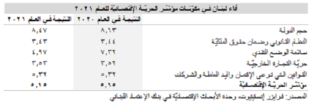 وقد أشار التقرير إلى أنّ أداء لبنان في ثلاث مكوّنات من عناصر مؤشِّر الحريّة الإقتصاديّة قد شهد تراجعاً في العام 2021، بحيث سَجَّلَ نتيجة 4.97 في معيار “سلامة الوضع النقدي”، و8.47 في مؤشِّر “حجم الدولة” و3.43 في معيار “النظام القانوني وضمان حقوق الملكيّة”. في المقلب الآخر، حَقَّقَ لبنان تحسُّناً في معيار “حريّة التجارة الخارجيّة” خلال العام 2021 بنتيجة 3.53، في حين بقيت نتيجة لبنان في مؤشِّر “القوانين والأنظمة التي ترعى الإئتمان واليد العاملة والشركات” ثابتة عند 5.32.