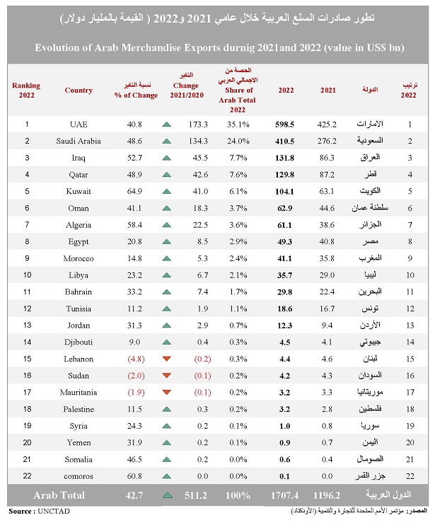 وأوضح أن حصة التجارة السلعية العربية ارتفعت إلى نحو 5.7% من الإجمالي العالمي، ونحو 13.2% من مجمل تجارة السلع في الدول النامية، أما على صعيد التوزيع السلعي فلازالت المواد الأولية بأنواعها تمثل الحصة الأكبر من إجمالي صادرات الدول العربية بنسبة تجاوزت 75%، حيث مثلت صادرات الوقود وحدها نحو 62% من إجمالي الصادرات السلعية، وفي المقابل استحوذت السلع المصنعة على الحصة الأكبر من إجمالي الواردات السلعية العربية بحصة 60% خلال عام 2022.