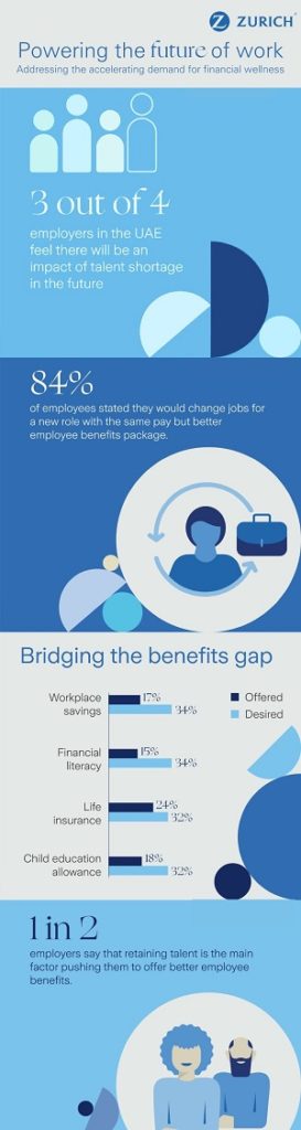 أطلقت شركة زيورخ العالمية للحياة في الشرق الأوسط استبياناً تفصيلياً بالتعاون مع شركة الأبحاث ريديوس إنسايتس حول مستقبل العمل في دولة الإمارات. ويأتي إطلاق هذا الاستبيان بالتزامن مع التغييرات الكبيرة التي يشهدها سوق العمل في الشرق الأوسط، ولا سيما في دولة الإمارات العربية المتحدة والمملكة العربية السعودية، حيث شهد العام الماضي وحده تغيير 1 من أصل 4 موظفين لمكان عملهم. وفي ظل هذه التغيرات، تحتاج الشركات للتركيز على كيفية الاحتفاظ بالمواهب والكفاءات. وأظهرت النتائج الأهمية الكبيرة لباقة مزايا الموظفين في المساهمة بالاحتفاظ بالمواهب والقدرة على جذب المزيد من الكفاءات في منطقة الشرق الأوسط.