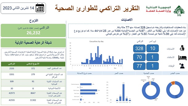 متابعةً للعدوان الاسرائيلي على جنوب لبنان، نشرت وزارة الصحة العامة التقرير التراكمي للطوارئ الصحية لـ 10 تشرين الثاني 2023.