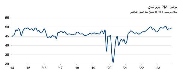 وسجّل مؤشر ®BLOM Lebanon PMI ارتفاعاً لأعلى مستوى له منذ تموز، من 48.9 نقطة في شهر تشرين الأول 2023 إلى 49.5 نقطة في شهر تشرين الثاني 2023، مشيراً إلى انكماش طفيف في النشاط الاقتصادي لشركات القطاع الخاص اللبناني.