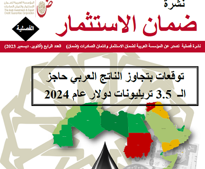 وأوضح المدير العام للمؤسسة السيد / عبد الله أحمد الصبيح في افتتاحية النشرة الفصلية الرابعة “ضمان الاستثمار” لعام 2023 أن توقعات أداء الاقتصاد العربي في مجملها جاءت إيجابية بالنسبة للعام 2024، بمعدل نمو متوقع 3.6% مدفوعاً بالنمو المرجح لتسع اقتصادات نفطية تسهم بنحو 78% من الناتج العربي والذي يمكن أن يعوض احتمالات انكماش اقتصادات أخرى.