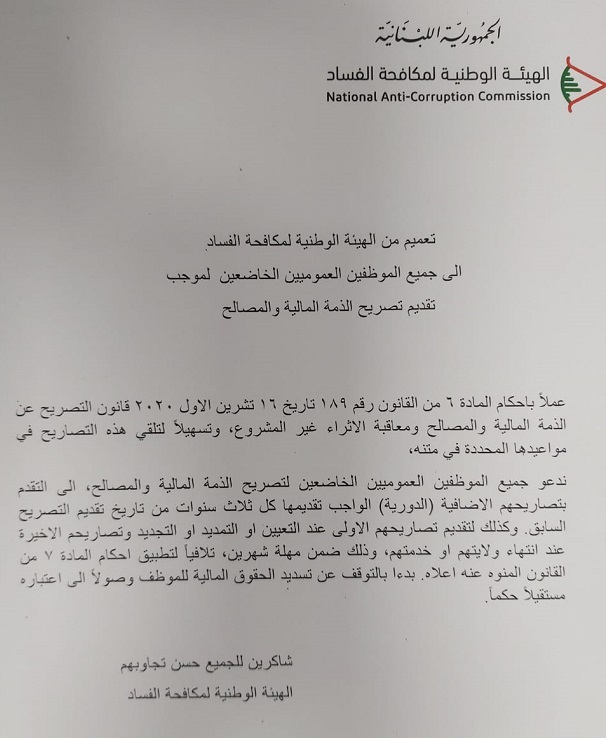 عملا باحكام المادة ٦ من القانون ١٨٩ تاريخ ١٦ تشرين الاول ٢٠٢٠ قانون التصريح عن الذمة المالية والمصالح ومعاقبة الاثراء غير المشروع، وتسهيلا لتلقي هذه التصاريح في مواعيدها المححدة في متنه،