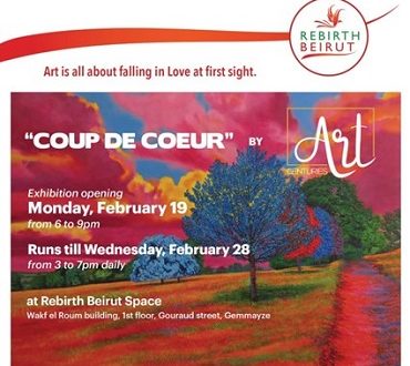 يسرّ جمعية Rebirth Beirut بالإعلان عن افتتاح معرضها الفني الجديد بعنوان : Coup de Coeur والذي من المقرّر افتتاحه في 19 شباط 2024 من الساعة 6 إلى 9 مساءً على ان يستقبل الزوار لغاية 28 شباط من الساعة 3 إلى 7 مساءً يوميًا وذلك في مقرّ الجمعية الكائن في منطقة الجميزة (شارع غورو)؛ هذا المعرض المُمَيَّز هو بمثابة احتفالًا بالفن والثقافة والحب.