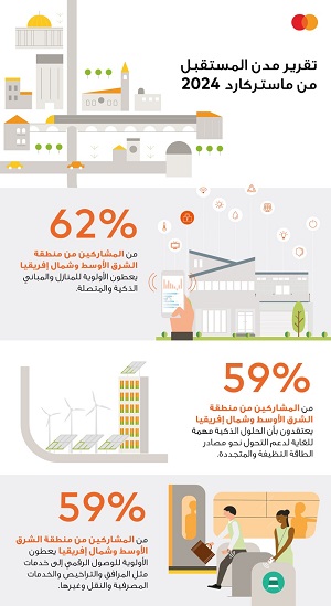 يرغب سكان منطقة الشرق الأوسط وشمال إفريقيا بأن تسهم التقنيات الرقمية في تحسين الكفاءة في أماكن عيشهم وعملهم وتجارب الدفع الخاصة بهم. وجاء الوصول الرقمي إلى خدمات مثل الخدمات المصرفية والمرافق والنقل (59%) في صدارة المجالات التي يمكن أن تسهم في تحسين تجارب حياتهم اليومية في المدينة. ويلي ذلك مستويات الخصوصية التامة والبيانات الشخصية (58%) ومنصة رقمية واحدة (تطبيق متكامل) يجمع بين كلّ الخدمات والمعلومات (53%).