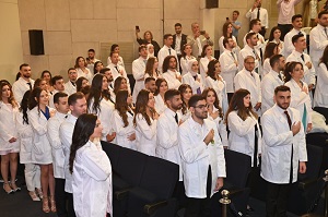 أمّا الدكتور سامي عازار، عميد كلية الطب والعلوم الطبيّة، فقد خاطب الطلاب قائلا: “مع انتقالكم إلى الحياة الطبّية العملية، أدعوكم وبإصرار، إلى الاستمرار في التعلمّ، ومزاولة البحوث، والسعي وراء المعرفة، فإنّ مجال الطب واسع ومتجدّد. احرصوا دائمًا على بناء العلاقات الودّية مع مرضاكم، تعلّموا من مرشديكم، وادعموا زملائكم، فهذه العلاقات تلعب دورًا ايجابيًا أمام إلتزامكم تجاه أفراد المجتمع وقدرتكم الهائلة على التأثير بحياتهم بشكل مباشر ووثيق”.