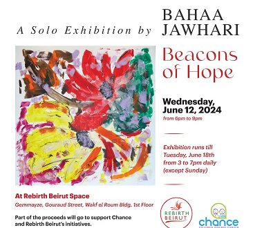 يسرّ جمعية Rebirth Beirut أن تعلن عن معرضها الجديد بعنوان Beacons of Hope أو “منارات الأمل”، المعرض الفردي الأول لبهاء جوهري. سيُفتتح المعرض يوم الأربعاء 12 حزيران 2024، من الساعة 6 مساءً إلى 9 مساءً في مقر الجمعية في الجميزة، ويستمر حتى الثلاثاء 18 حزيران، من الساعة 3 إلى 7 مساءً يومياً، ما عدا يوم الأحد.