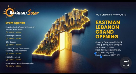 ستقدم صالة العرض في لبنان خط المنتجات المتقدمة لشركة “إيستمان”، بما في ذلك بطارية الليثيوم الثورية من “إيستمان”، المصممة لتوفير بيئة طاقة أنظف وأكثر موثوقية. سيتمكن الزوار من استكشاف مجموعة واسعة من حلول الطاقة الشمسية، بما في ذلك العاكسات الشمسية، الألواح، البطاريات، عاكسات المضخات، ووحدات التحكم في الشحن، وكلها تهدف إلى تسهيل التحول إلى الطاقة النظيفة.