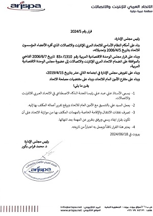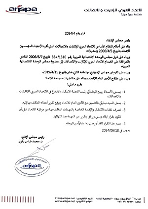 أصدر د.فراس بكور رئيس مجلس ادارة الاتحاد العربي للانترنت والاتصالات المنضوي تحت عضوية مجلس الوحدة الاقتصادية العربية التابعة لجامعة الدول العربية ثلاثة قرارات تقضي بتكليف كل من السادة أعضاء مجلس إدارة الاتحاد الاستاذ ربيع مصطفى بعلبكي رئيسأ للجنة الابتكار والإبداع والاستاذ علي عبد علي رئيسأ للجنة الذكاء الاصطناعي والامين العام المساعد المهندس علي علي رئيسأ للجنة الأمن السيبراني في الاتحاد وذلك لأهمية اللجان الثلاثة في تطوير بنية الإنترنت والإتصالات وتوظيفها في تعزيز الاقتصاد الرقمي كما وهنأ الأمين العام للاتحاد السيد كميل مكرزل الزملاء على توليهم هذه المهام الهامة متمنياً لهم التوفيق في وضع الخطط الاستراتيجية لتعزيز قطاع الإنترنت والاتصالات في الوطن العربي وفتح الفرص للابتكارات وتوظيف الذكاء الإصطناعي في بيئة آمنة للمستخدمين والمثتثمرين والمبتكرين والمطورين وقد أتت هذه القرارات بناء على الحاجة التي أصبح يستدعيها عمل الاتحاد والقضايا المكلف بها عربيا، لاسيما بعد أن أسفرت الجهود و لاشهر على التوالي في ولادة مبادرة الحاضنة العربية لمشاريع الذكاء الاصطناعي في خدمة الريادة والابتكار في الوطن العربي والمدعومة من أهم الاتحادات والمنظمات والهيئات الأكاديمية العربية الشريكة في المبادرة،