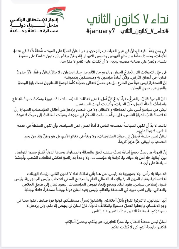 ‘‘نداء ٧ كانون الثاني” إنجاز الإستحقاق الرئاسي، مدخل لبناء دولة مستقرة فاعلة وجاذبة.
