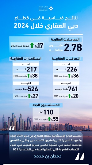 وتأكيداً على الجاذبيّة الاستثماريّة العالميّة للسوق العقاري في دبي، حقّقت المبيعات العقاريّة نموّاً لافتاً بعد تسجيل 217 ألف مبايعة بقيمة 526 مليار درهم، وبنمو وصل إلى 38% في عددها و27% في قيمتها على التوالي، في حين استقطبت دبي 110,000 مستثمراً جديداً في القطاع العقاري بنمو 55%، ما يؤكد دور دبي الرائد في توفير بيئة استثمارية مثالية تستقطب المستثمرين من حول العالم وتدعم النمو المستدام للقطاع.