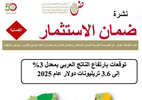 كشفت المؤسسة العربية لضمان الاستثمار وائتمان الصادرات (ضمان) عن نمو الناتج المحلي الإجمالي العربي بمعدل 1.8%، ليتجاوز 3.5 تريليونات دولار عام 2024، رغم التحديات والأحداث التي شهدتها المنطقة، وذلك مع استمرار تركزه الجغرافي في السعودية، والإمارات، ومصر، والعراق، والجزائر، بحصة تجاوزت 72% من إجمالي المنطقة.