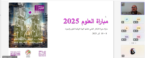 عقدت الهيئة الوطنية للعلوم والبحوث جلسة معلومات افتراضية عبر Microsoft Teams حول مباراة العلوم 2025، وذلك مساء يوم الأربعاء في 26 آذار 2025، بحضور حوالي مئة وخمسين معلّم/ة، طالب/ة، ومتخصص/ة في مجال التربية.