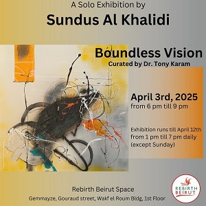 تعود الفنانة العراقية سندس الخالدي إلى الساحة الفنية في لبنان بمعرضها الفردي المرتقب “Boundless Vision”، بإشراف الدكتور طوني كرم في Rebirth Beirut الجميّزة، شارع غورو، بناية وقف الروم.
