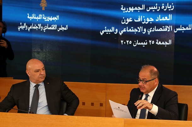 موقف الرئيس عون جاء خلال زيارته قبل ظهر اليوم المجلس الاقتصادي والاجتماعي والبيئي بحضور النائبين شوقي دكاش وفادي علامة، ورئيس الهيئات الاقتصادية محمد شقير، ورئيس الاتحاد العمالي العام الدكتور بشارة اسمر، ورؤساء نقابات: الأطباء في بيروت الدكتور يوسف بخاش، وأطباء الاسنان الدكتور رونالدو يونس، والصيادلة جو سلوم، والمحررين جوزيف قصيفي، والصحافة عوني الكعكي، والمحامين في الشمال سامي الحسن، ورئيس جمعية تجار بيروت نقولا الشماس، ورئيس اتحاد نقابات السياحية بيار اشقر، ورئيس غرفة التجارة في الشمال توفيق دبوس، ورئيس غرفة التجارة في البقاع منير التيني، ورئيس غرفة التجارة والصناعة في الجنوب محمد صالح، ورئيس نقابة مستوردي النفط مارون شماس، ورئيس نقابة السوبرماركت نبيل فهد، وامين عام المدارس الكاثوليكية الاب يوسف نصر، ونقيب المعلمين في المدارس الخاصة نعمة محفوظ، ورئيس مجلس الاقتصاديين اللبنانيين صلاح عسيران، ورئيس اتحاد المستثمرين اللبنانيين جاك صراف، وامين عام اتحاد نقابات السياحية جان بيروتي، ورئيسة جمعية السيدات القياديات مديحة رسلان.