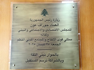 وبعدما قدم الدكتور عربيد الى الرئيس عون درع المجلس، التقطت الصور امام اللوحة التي تؤرخ للزيارة والتي كتب عليها :”زيارة رئيس الجمهورية العماد جوزاف عون للمجلس الاقتصادي والاجتماعي والبيئي ولقاؤه ممثلي قوى الإنتاج والمجتمع المدني المنظم الجمعة 25 نيسان 2025. بالحوار نبني الثقة وبالشراكة نرسم المستقبل”.