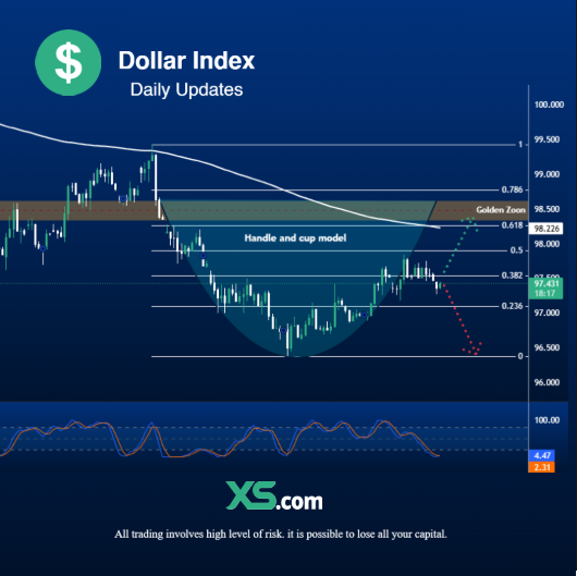 يعكس الرسم البياني لمؤشر الدولار الأمريكي (DXY) على الإطار الزمني 4 ساعات تكوّن نموذج فني كلاسيكي يُعرف بـ”الكوب والمقبض” (Handle and Cup Model)، وهو من النماذج الانعكاسية الإيجابية التي تدل غالبًا على احتمالية استمرار الاتجاه الصاعد إذا اكتمل بشروطه. والسعر حالياً يتحرك قرب مستوى تصحيحي هام عند فيبوناتشي 0.382، والذي يقع عند حدود 97.40، في حين أن المنطقة الذهبية (Golden Zone) بين مستويي 0.618 و0.786 عند 98.20 – 98.80 تمثل مقاومة قوية لأي حركة صعودية لاحقة.