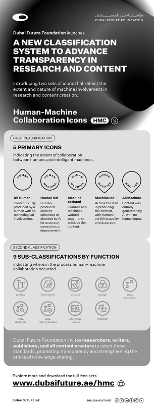 وتعمل الأيقونات التصنيفية، التي طوّرتها مؤسسة دبي للمستقبل، على قياس مستوى التعاون بين الإنسان والآلة (Human-Machine collaboration – HMC) ، وتوفر معيارًا عالميًا جديدًا للشفافية، يحدد بوضوح مدى تعاون البشر والذكاء الاصطناعي طوال عملية الإنتاج. تجدر الإشارة إلى أن هذا التصنيف متاح للاستخدام مجاناً، ومحمي بحقوق الطبع والنشر لضمان الاتساق، ومتوفر بشكل مفتوح للجميع من الباحثين والناشرين وصنّاع المحتوى حول العالم.