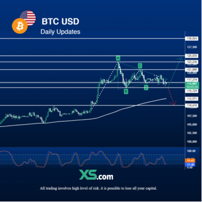 الرسم البياني الفني لزوج BTC/USDعلى إطار الأربع ساعات، يوضح تشكّل نمط تصحيحي كلاسيكي ضمن موجة ABC، حيث تم تسجيل القمة “A” بالقرب من مستوى 123,236، تلتها حركة تصحيحية نحو القاع “B” عند 115,729 قبل أن تشهد الأسعار ارتدادًا محدودًا عند “C”. وهذا النمط يشير إلى اكتمال موجة تصحيحية محتملة، مما قد يُمهّد لحركة صعودية جديدة بشرط الثبات أعلى دعم 115,729 وعدم كسره بإغلاق واضح.