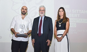 ثم تحدث نويهض عن العنف والأهوال التي يتعرض لها أهل غزة منذ قرابة العامين وعن الأسباب التي أدت إلى اتخاذ لجنة الاختيار قرارًا بتكريم جميع الأخصائيين في مجال الرعاية الصحية في غزة بصفتهم أوائل الحائزين على جائزة أبو ستة – جيلبرت الإنسانية. وقد اتخذت اللجنة القرار بعد أن أدركت اللجنة ضرورة تكريم جميع من ساهم في دعم شعب غزة، “من المسعفين والممرضين وسائقي سيارات الإسعاف والمستجيبين الأوائل إلى رب الأسرة الذي سعى لإنقاذ كل فرد استطاع الوصول إليه من أفراد عائلته،” بحسب نويهض. وقد استلم الجائزة بالنيابة عنهم الدكتور محمد زيارة، جراح التجميل الذي عمل وعاش في غزة، والذي يقيم حاليًا في لبنان ويتدرب على الجراحة الترميمية تحت إرشاد الدكتور أبو ستة.